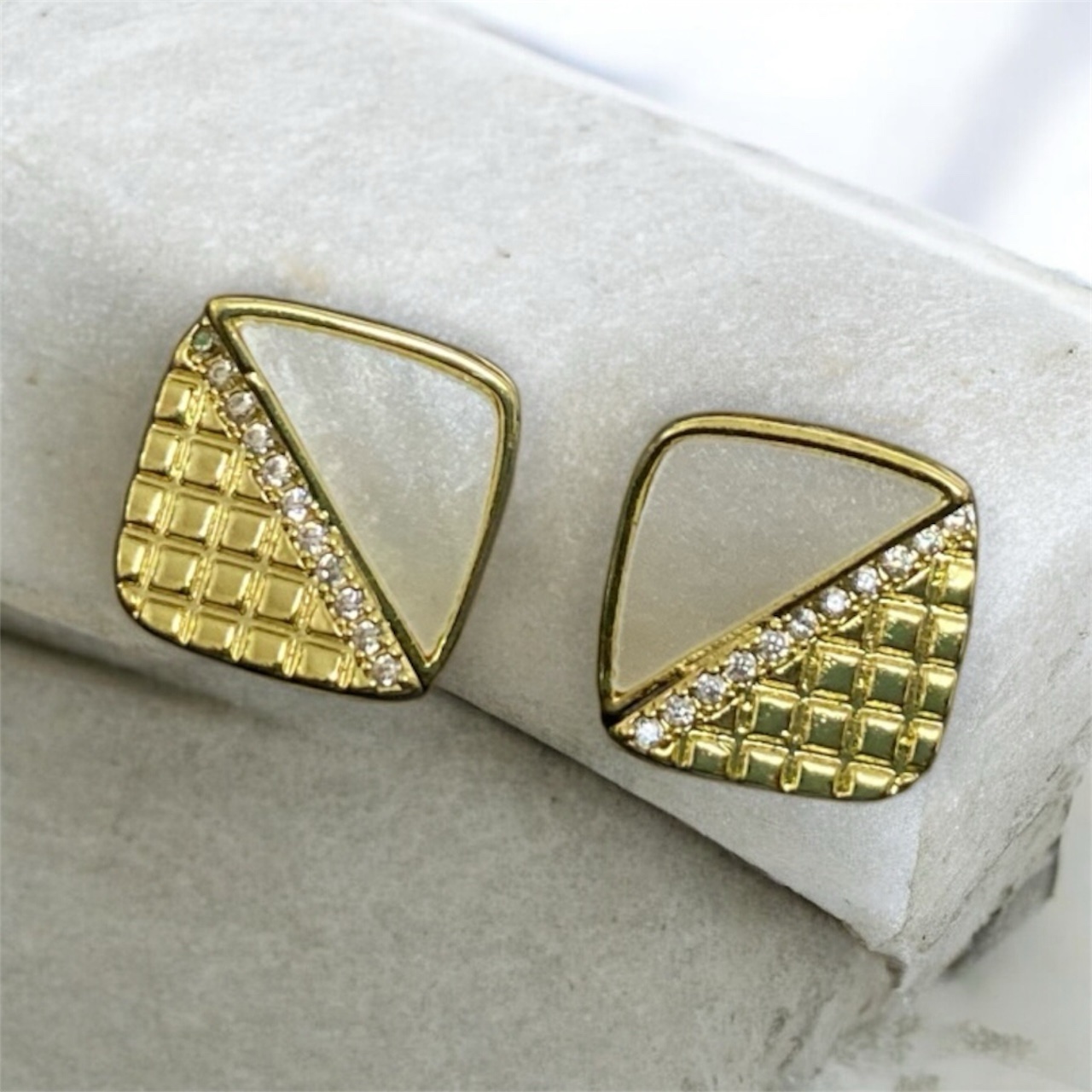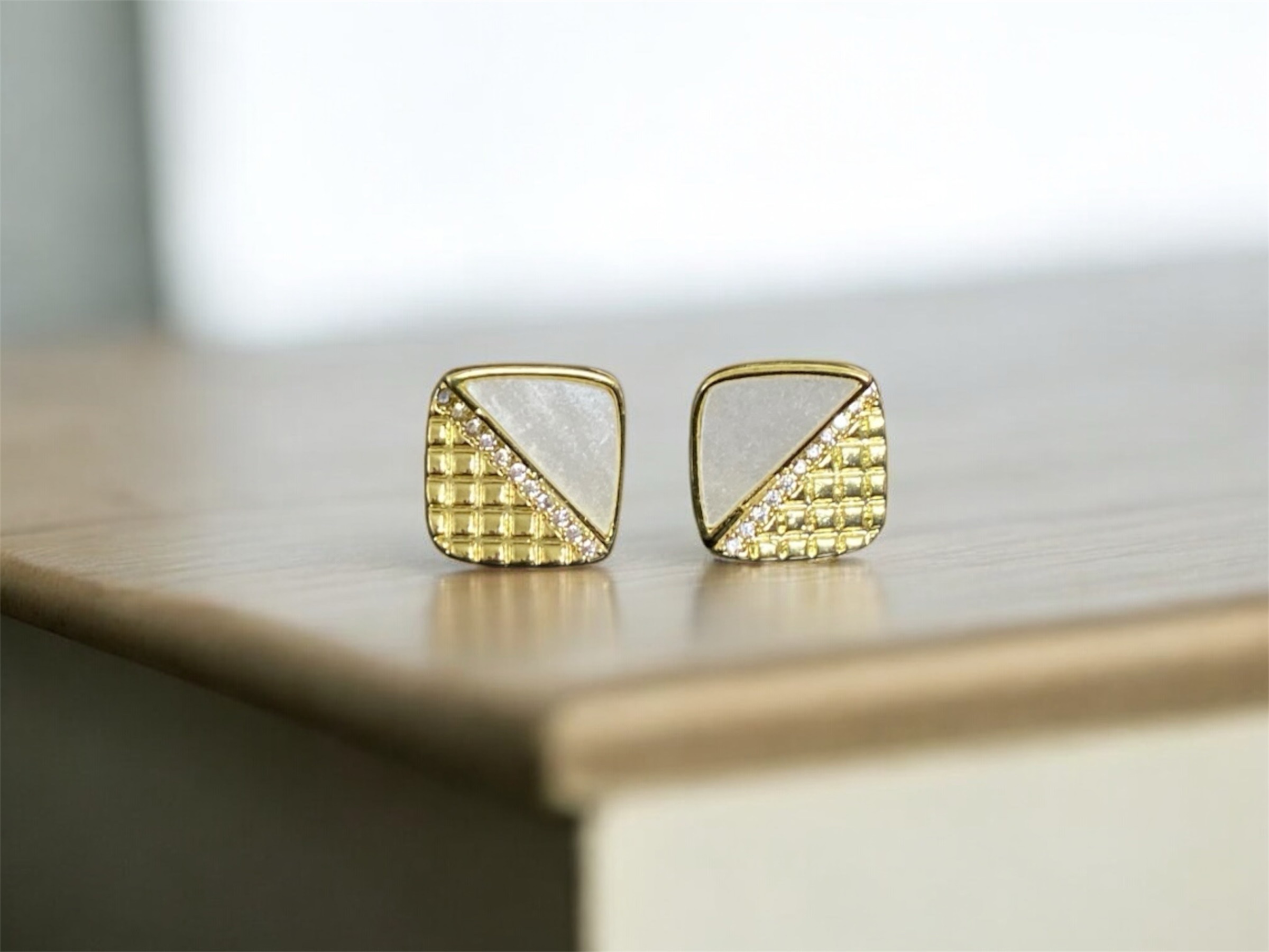 + ShippingChic and minimal, these Geometric Gold Stud Earrings feature a unique angled cut design that blends textured gold detailing with a glossy pearl-like finish. The diagonal crystal line adds a refined sparkle, making them perfect for both casual and festive looks.