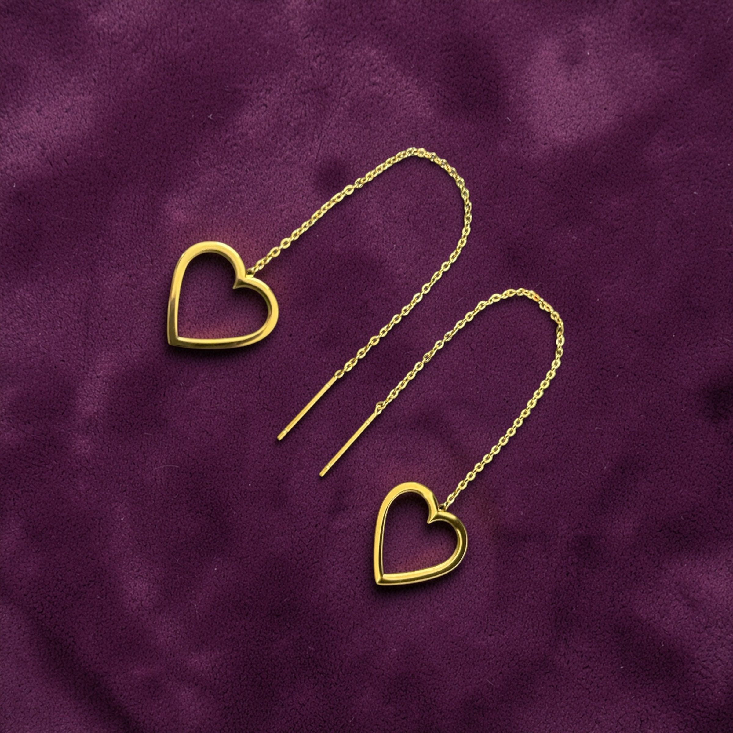 Heart shape threader earrings in gold finish. Premium quality, skin-friendly, anti-tarnish and waterproof.