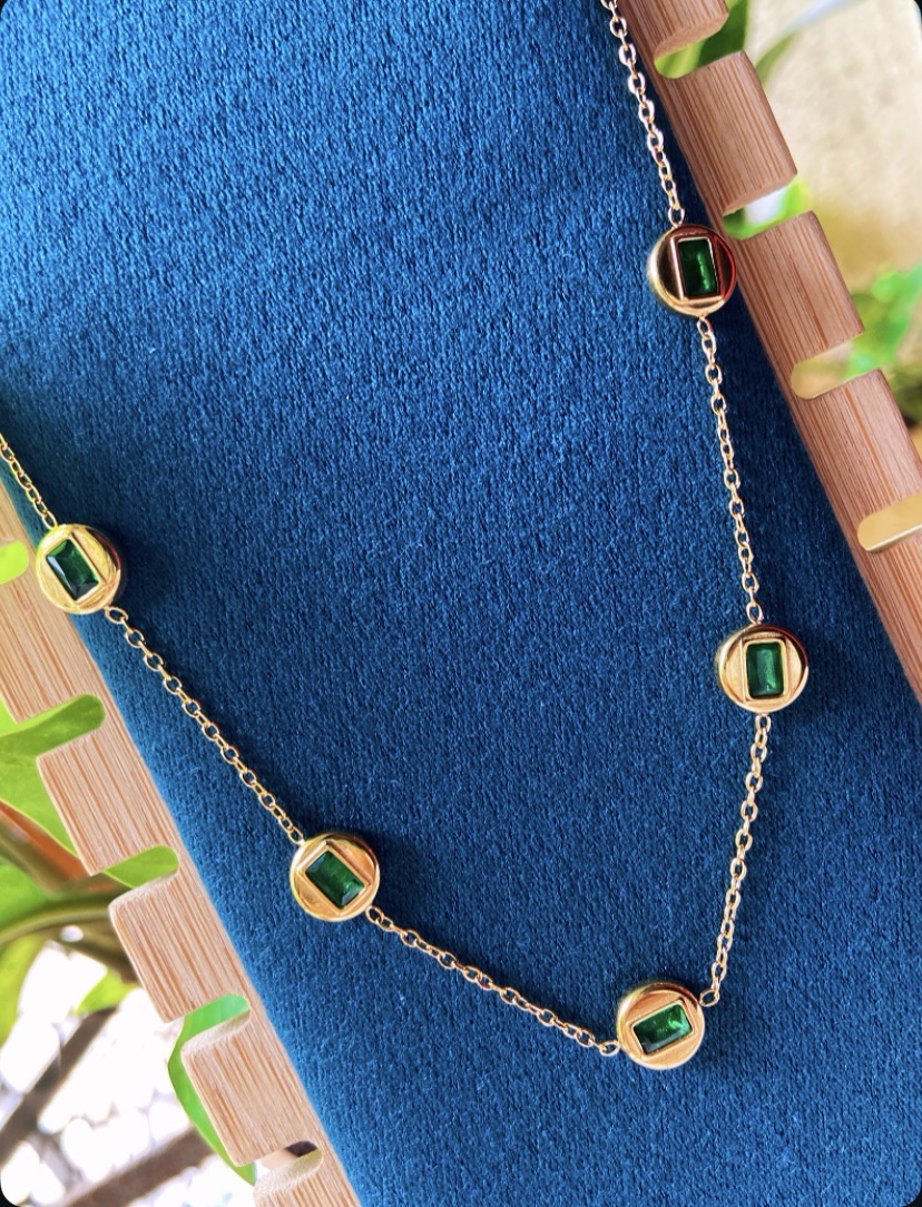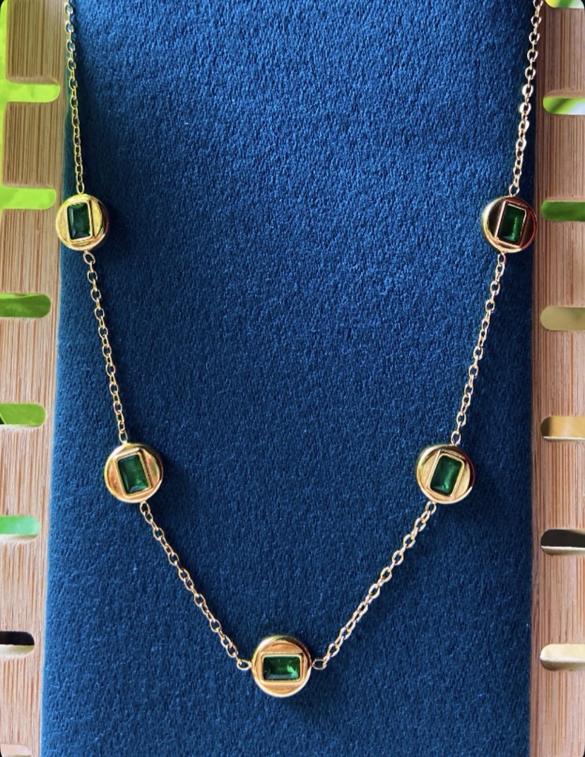 + ShippingOur Green Stone Charm Necklace is the perfect blend of elegance and sophistication. Designed with five emerald-green stones encased in smooth gold settings along a dainty gold chain, this necklace adds a refined pop of color to any outfit.