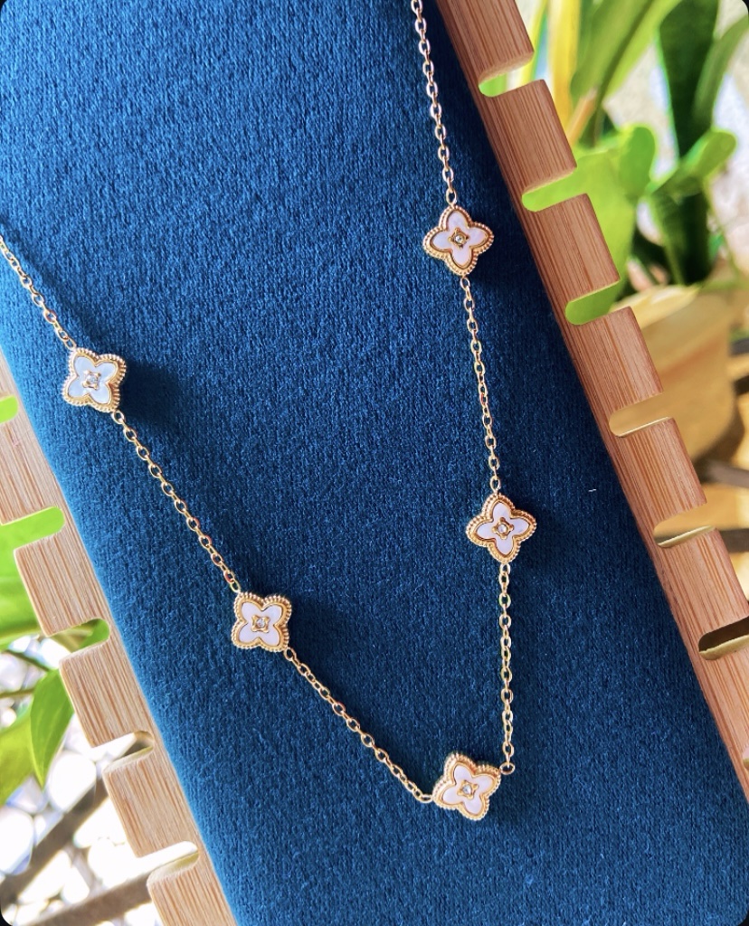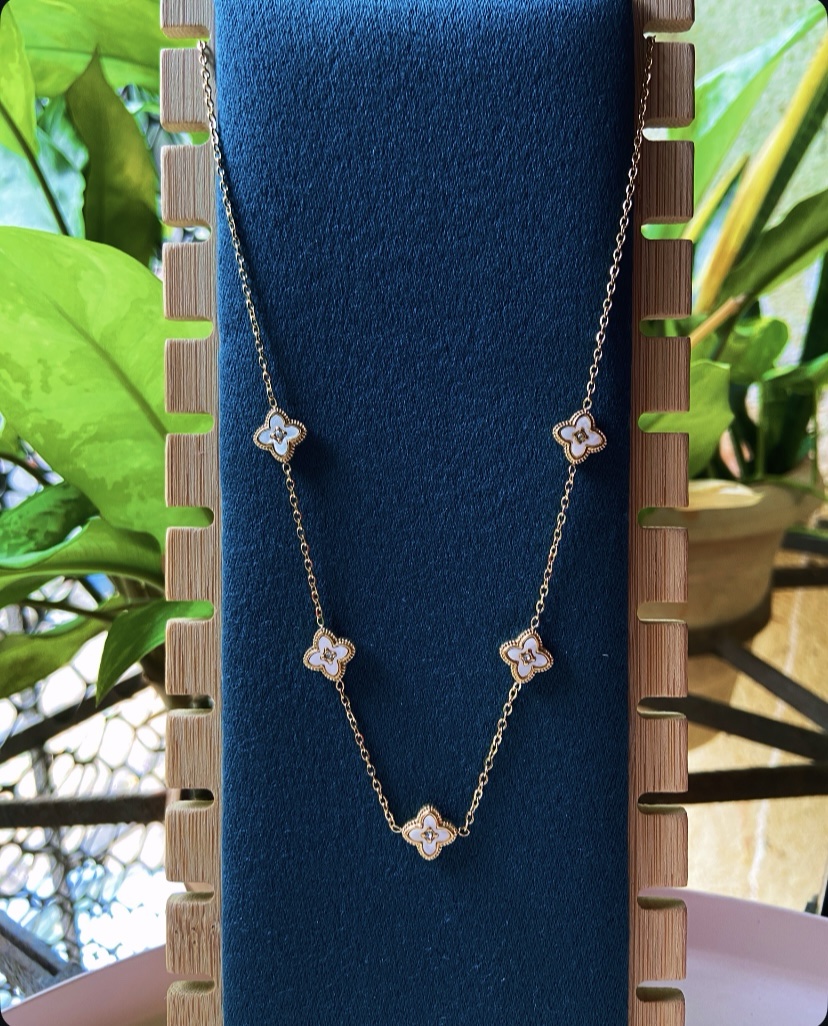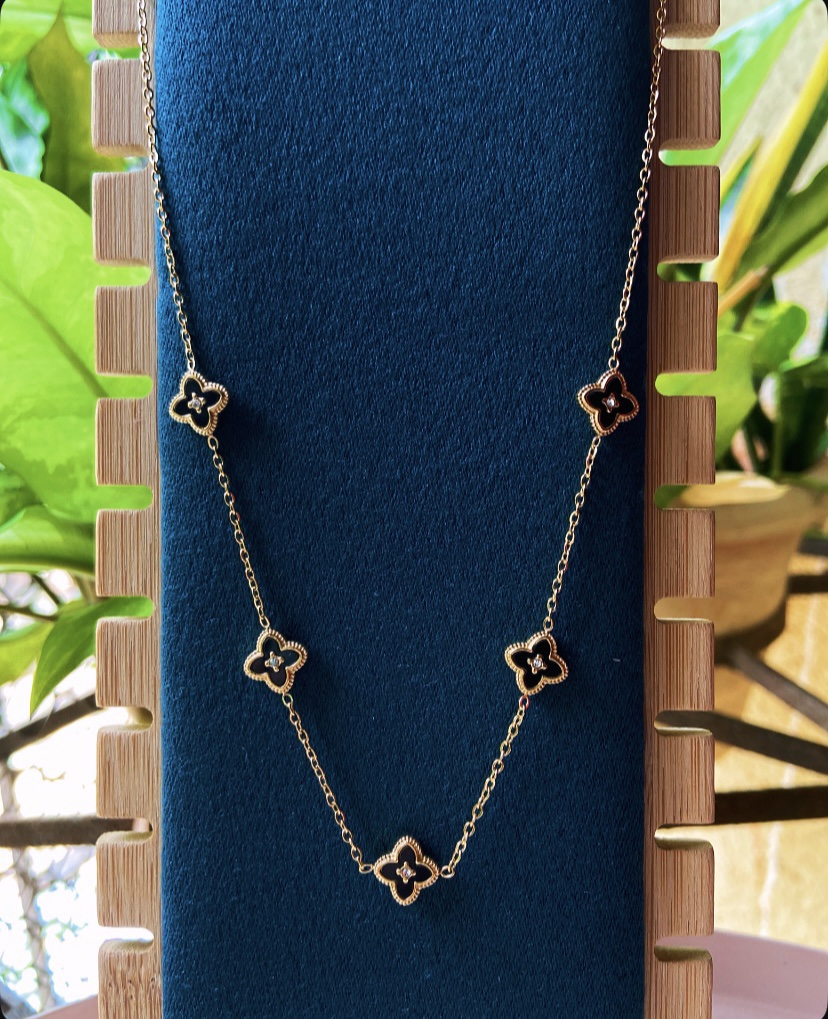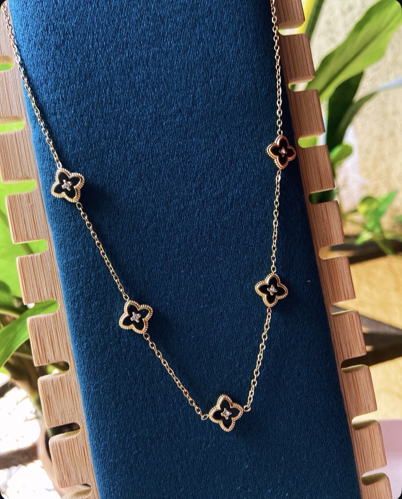 Our Reversible Clover Necklace is a perfect blend of elegance and versatility. Designed with five clover charms attached to a minimal gold chain, this piece gives you two beautiful looks in one — black clovers on one side and white clovers on the other.